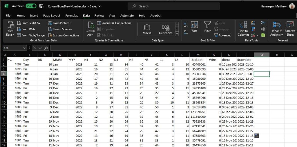 I now have a dataset in a form suitable for analysis. A draw consists of five numbers (N1 to N5) with values ranging from 1 to 50, and two additional numbers (L1 and L2) ranging from 1 to 12. Each row represents a draw, and is identified by its draw date. We have also the day of the week on which the draw occurred.