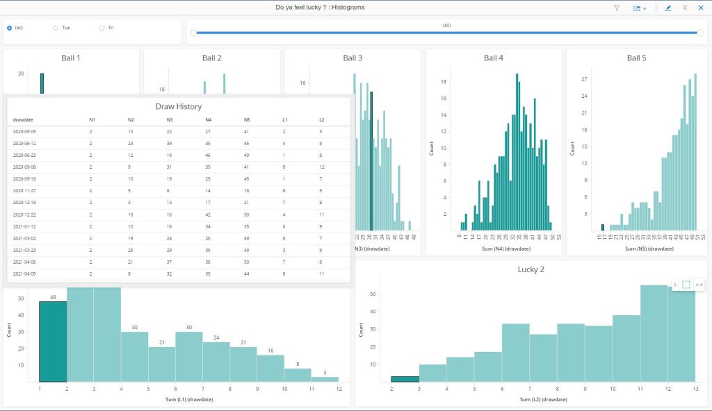 And this where I had an interesting insight: What if there was a relationship between the value of one ball versus another ? This though occurred to me when, using an info window, I clicked on the value 2 of the histogram for ball number 1, I noticed that ball number 2 had the value 10 repeating on more than one line. Exciting !