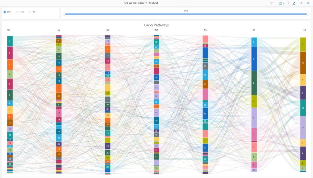 Sankey diagrams confuse me, because I have struggled to find a use case for them that didn’t require some serious thought to interpret. But in this instance, it was the perfect method to visualise the relationship between a pair of numbers repeating across the set of (n1,n2,n3,n4,n5,l1,l2).