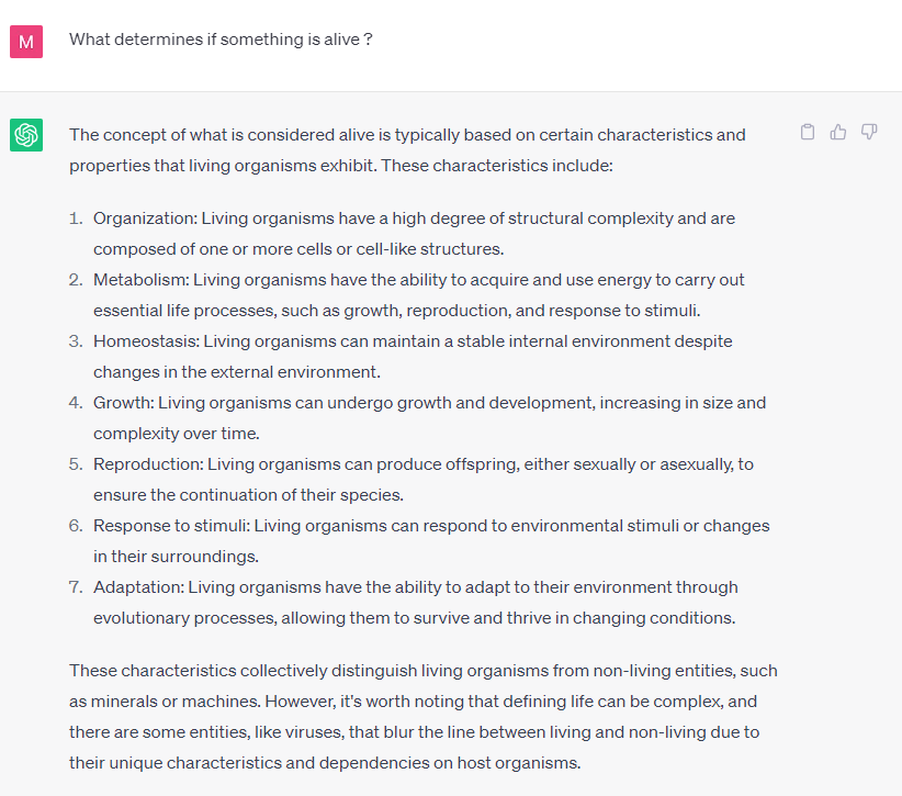 I particularly like ChatGPT’s first sentence: MicroStrategy’s semantic graph is not a living entity in the biological sense. Let’s ask what determines if something is alive: